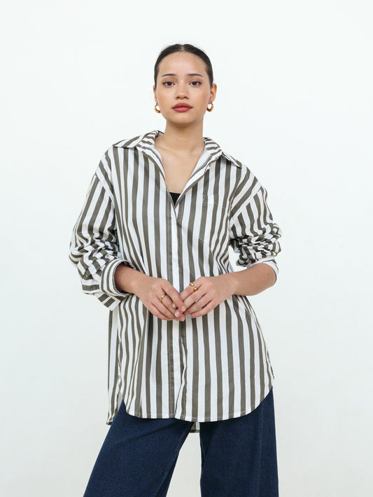 Tania Basic Oversized Shirt with Pocket - Striped Dark Green