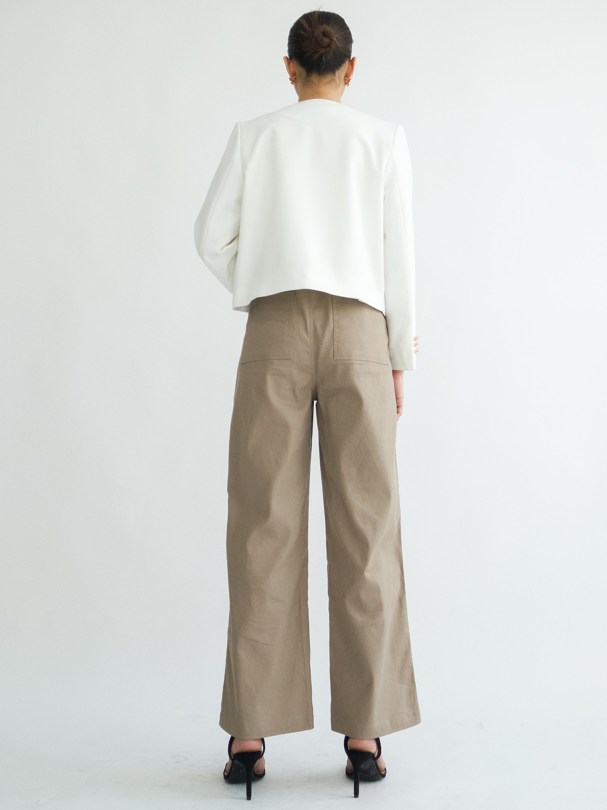 Wide Leg Pants & Highwaist. Patch pocket at the back. Pronounced seam with belt loop, embossed metal button fastening and YKK zip fly fastening at the front.