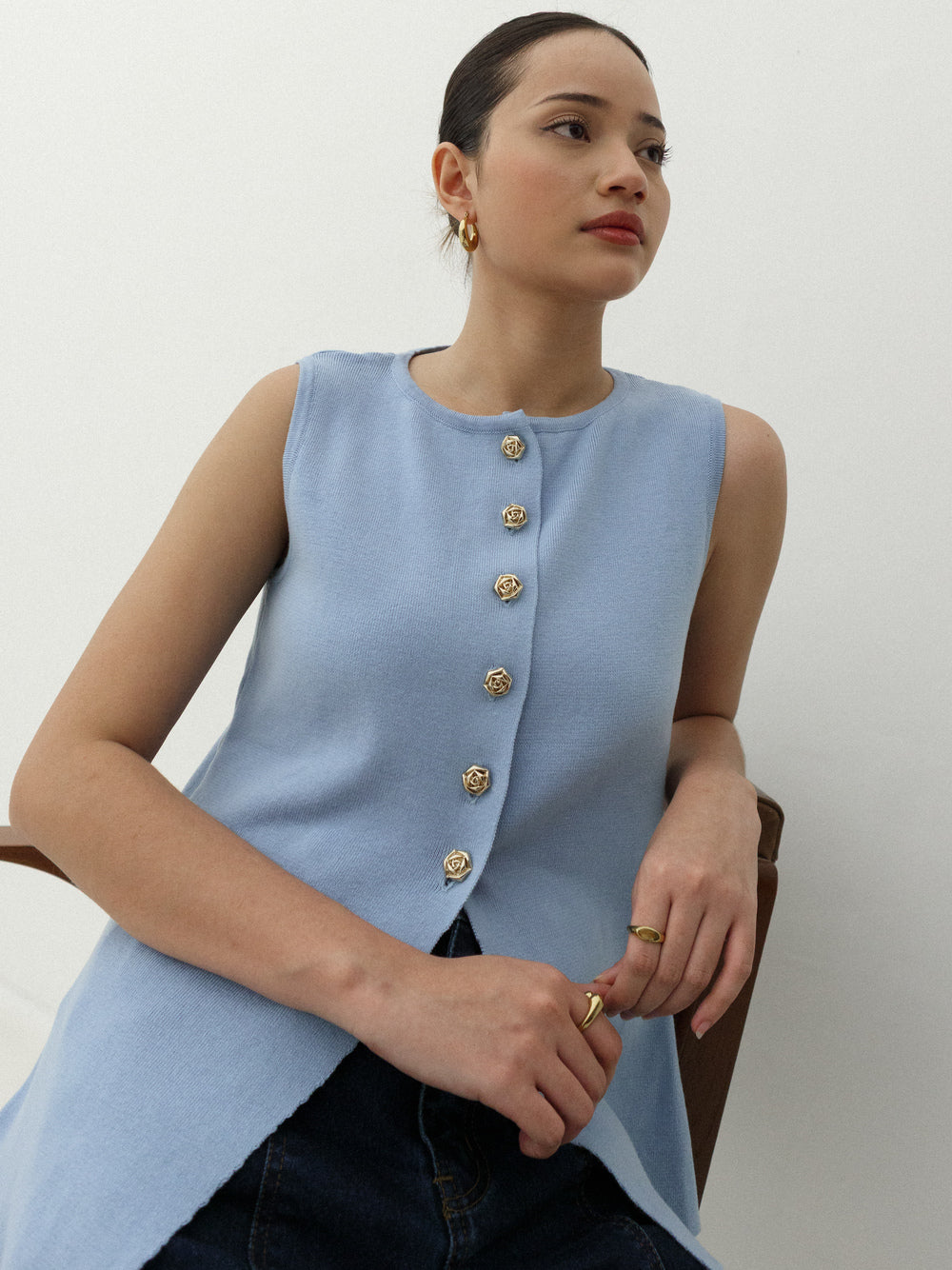 Plain knit waistcoat top with a round neckline and sleeveless design. Fittted Silhouette, Assymetric hemline and gold button fastening at the front.