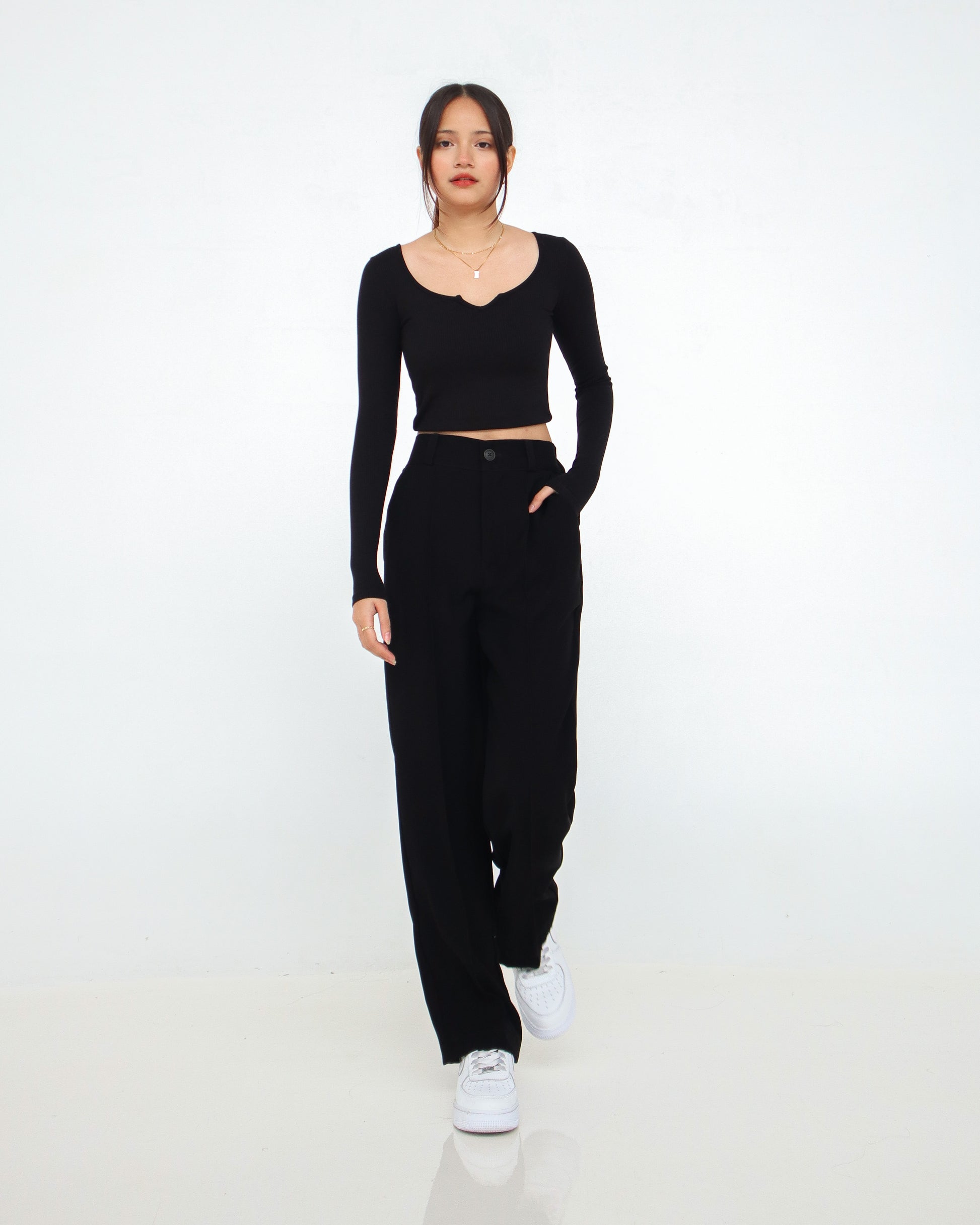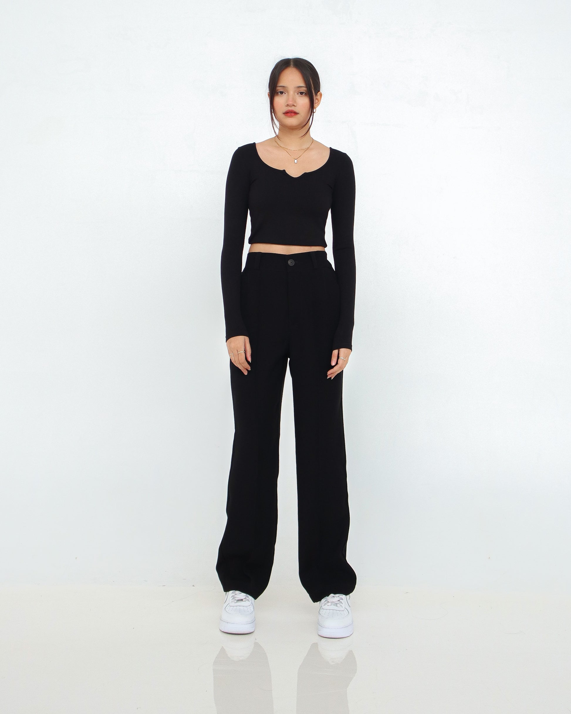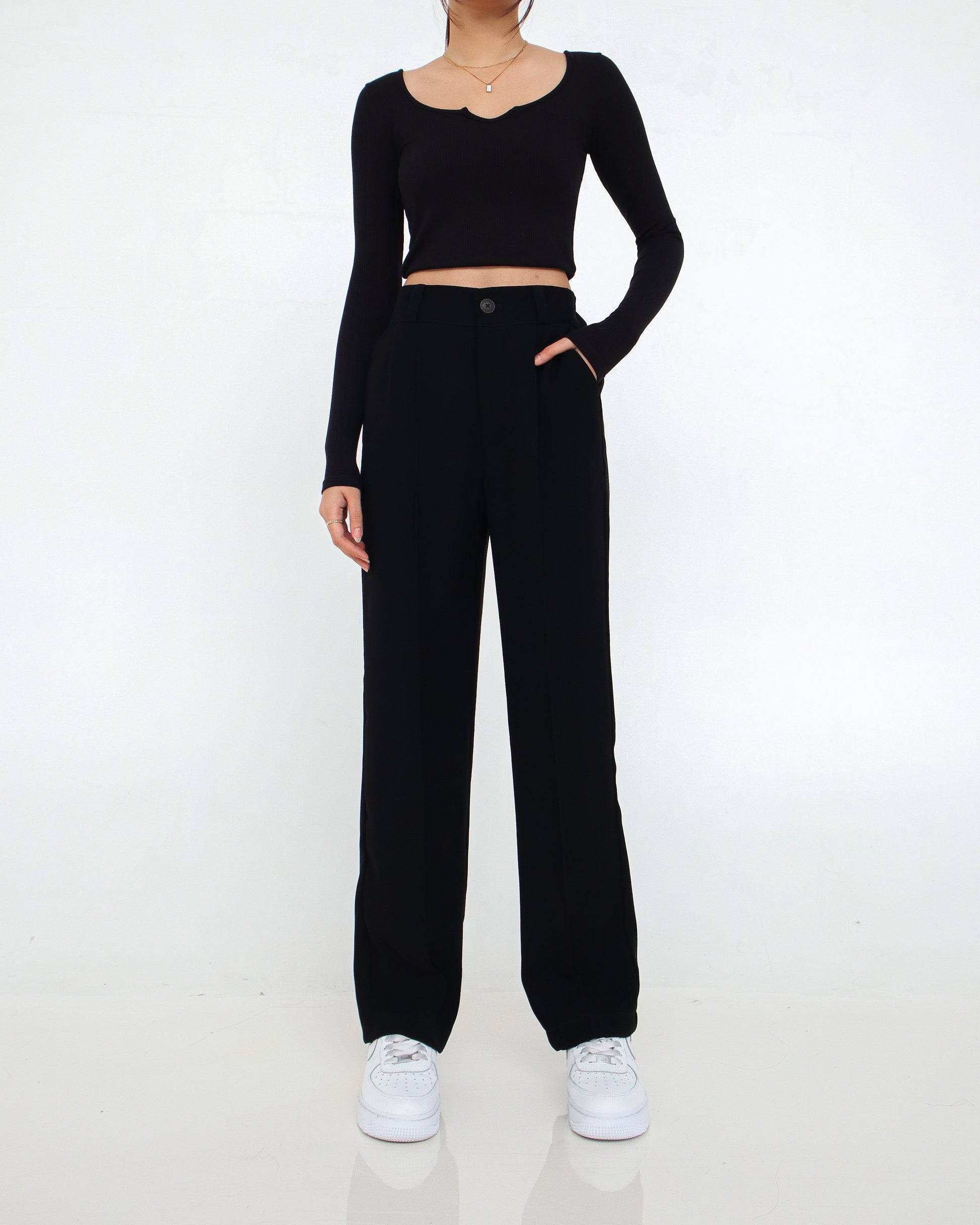 High-waist and straight fit long trousers. Both side pockets, darts, creaseline, belt loops, and button with zip fastening at the front. An elastic waistband at the back.