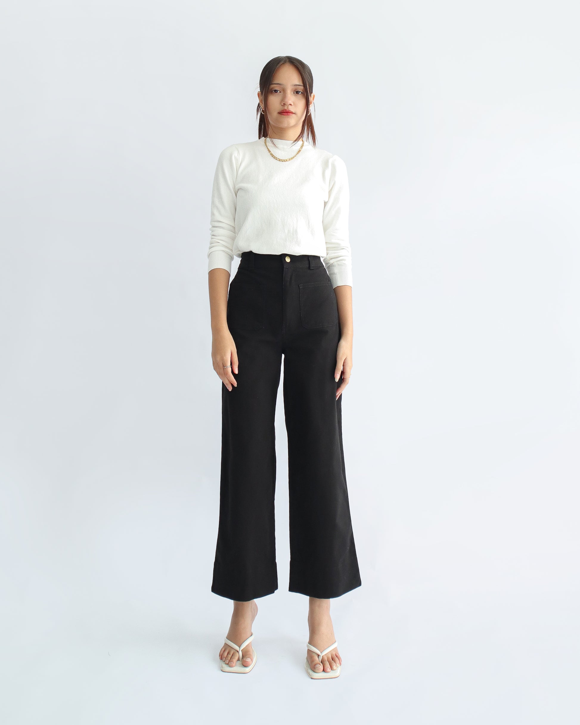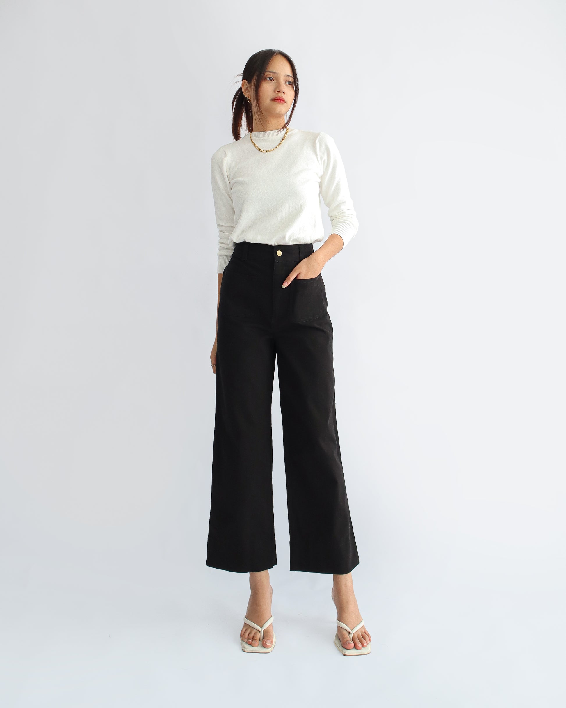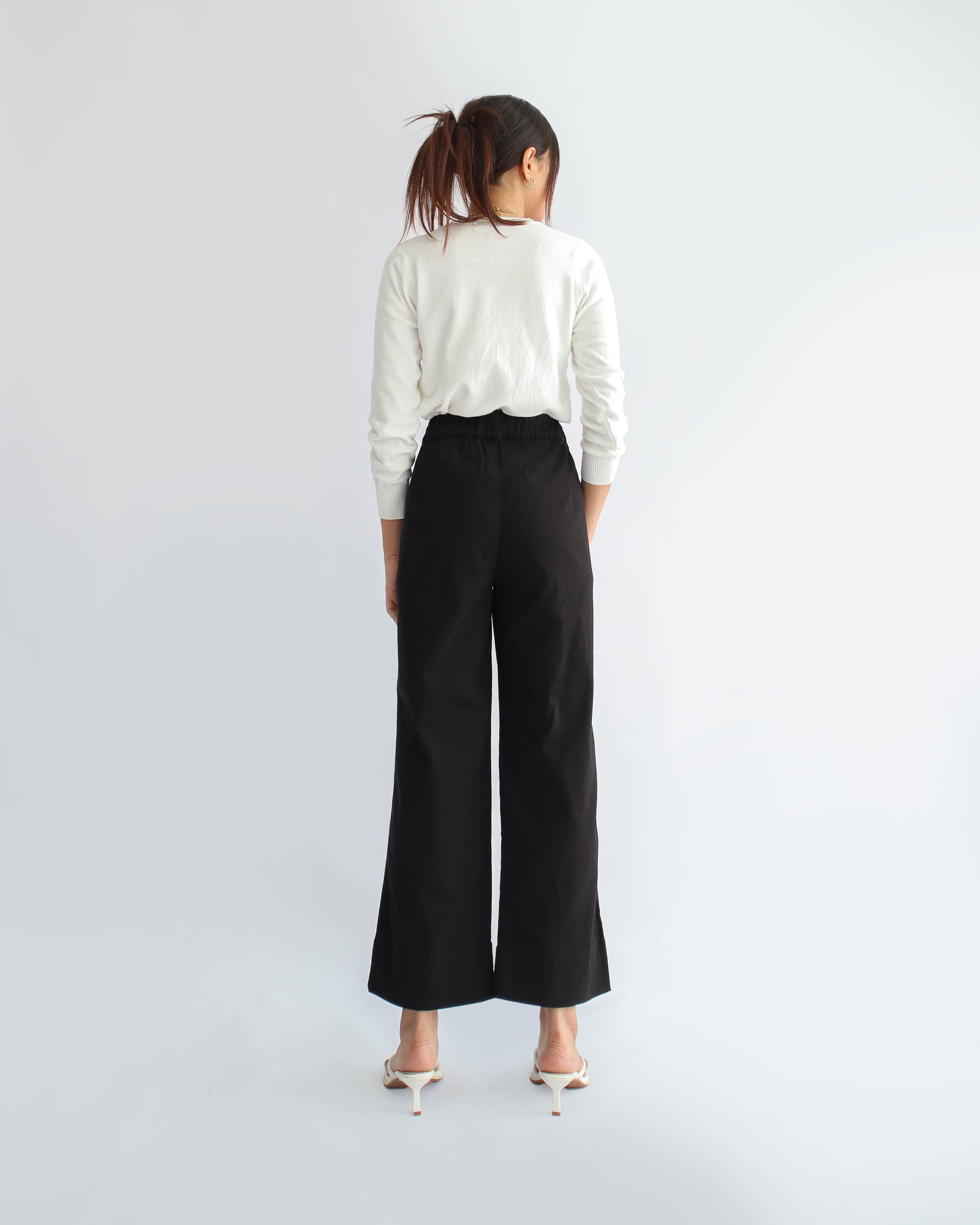 High rise and cropped straight leg pants made with a cotton twill. Patch pocket, belt loops, metal button and YKK zip fly fastening at the front. Elastic waistband at the back.