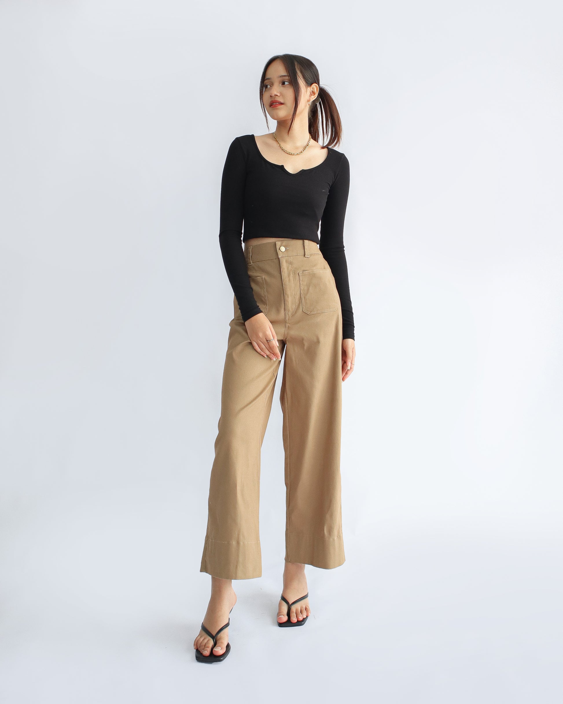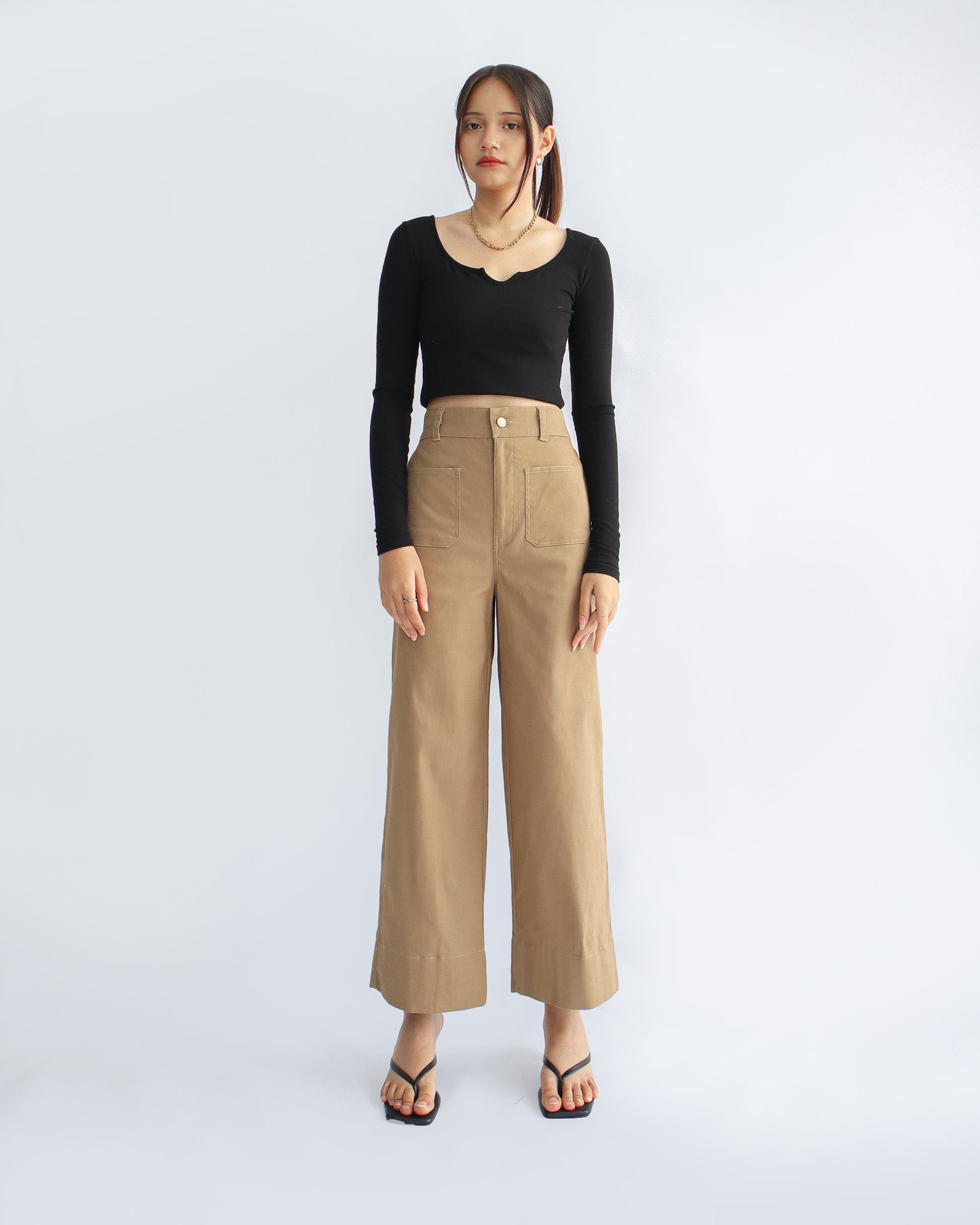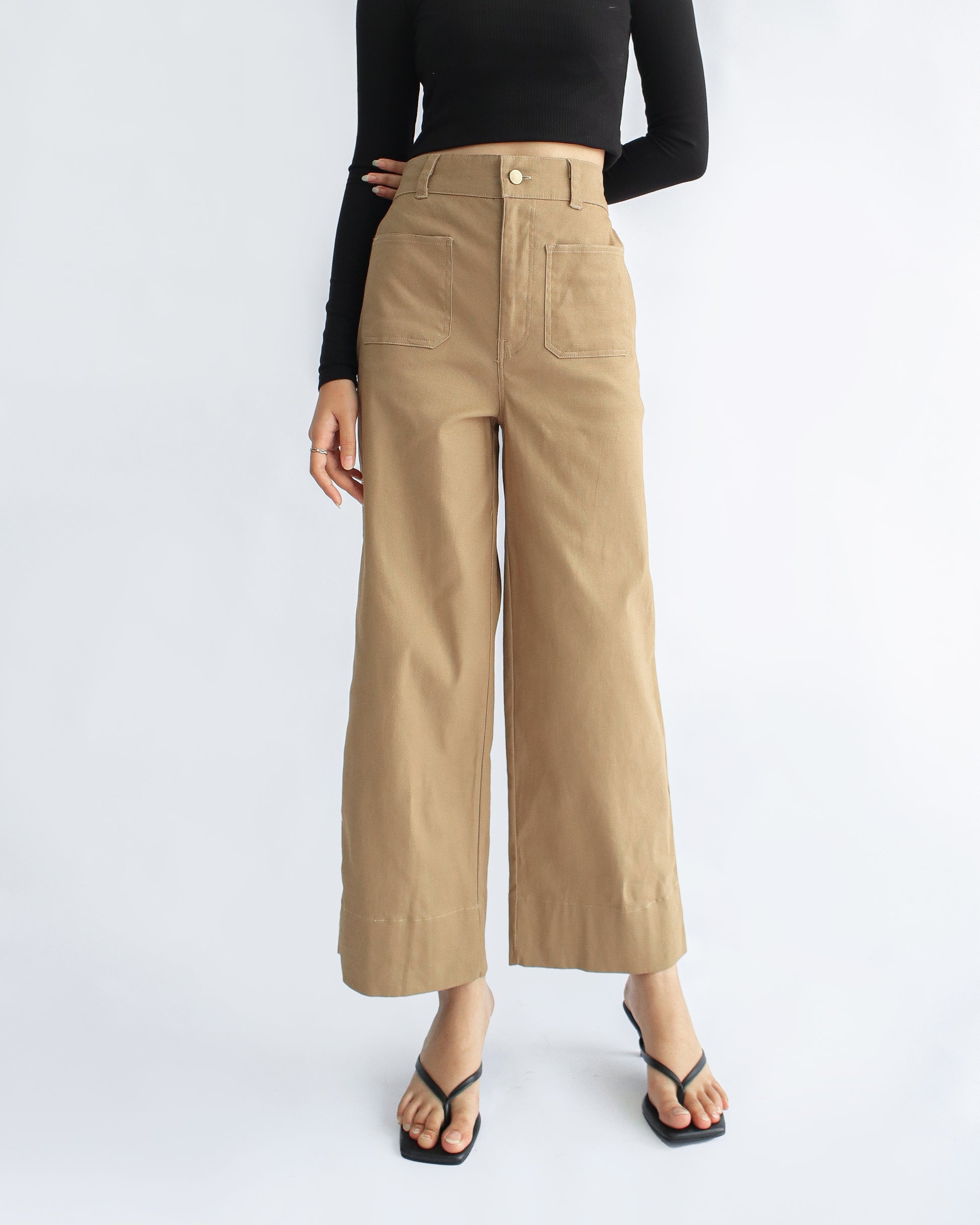 High rise and cropped straight leg pants made with a cotton twill. Patch pocket, belt loops, metal button and YKK zip fly fastening at the front. Elastic waistband at the back.