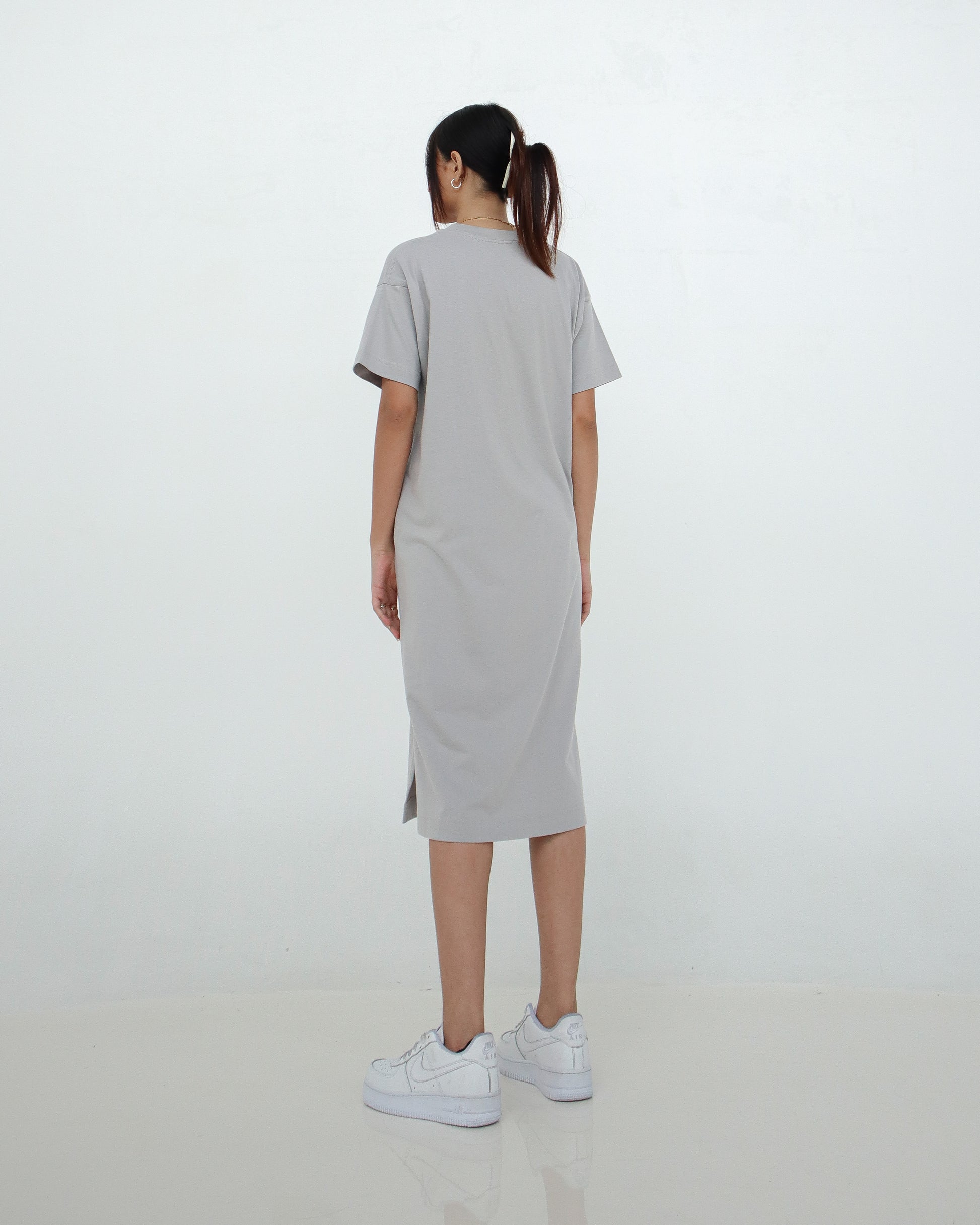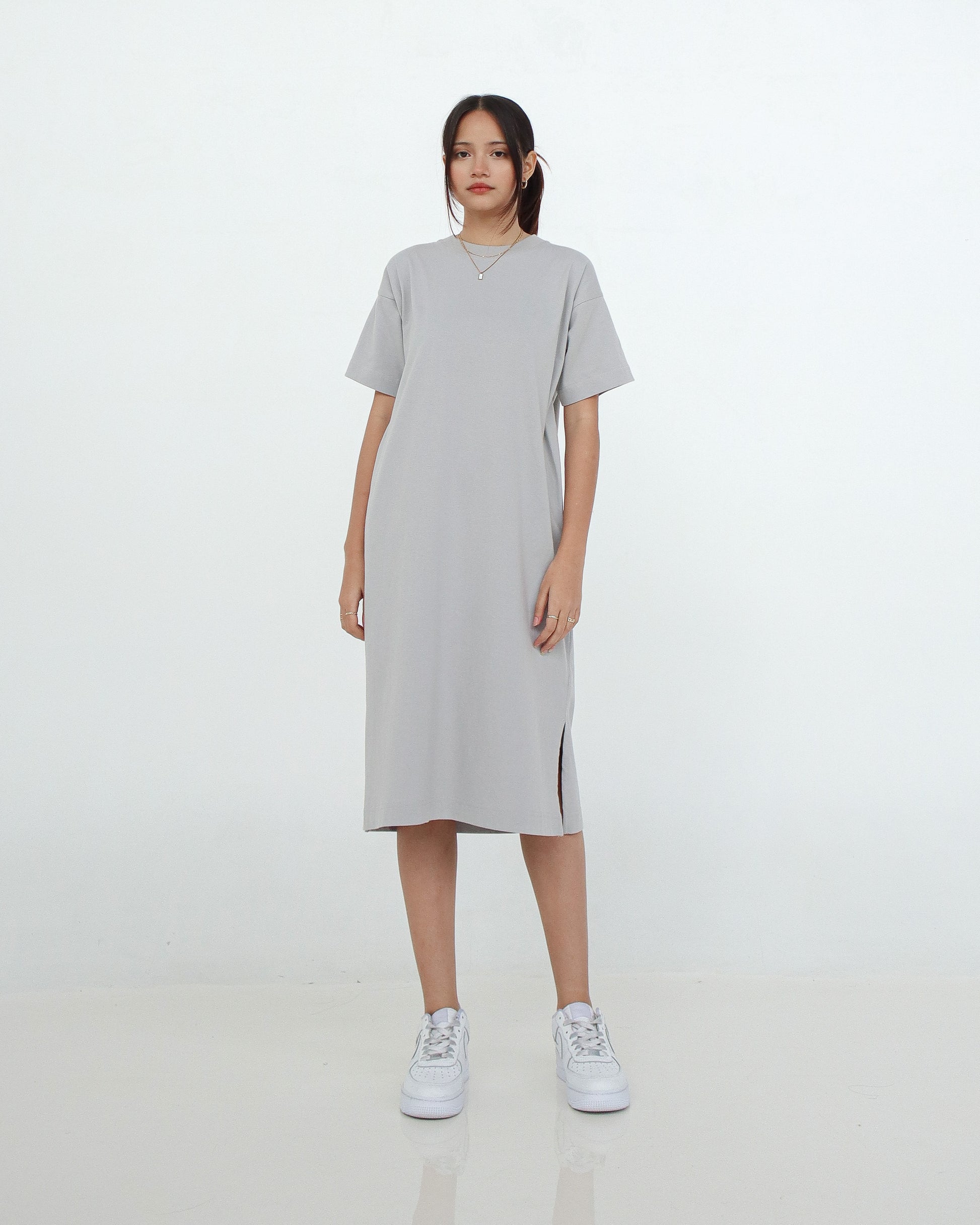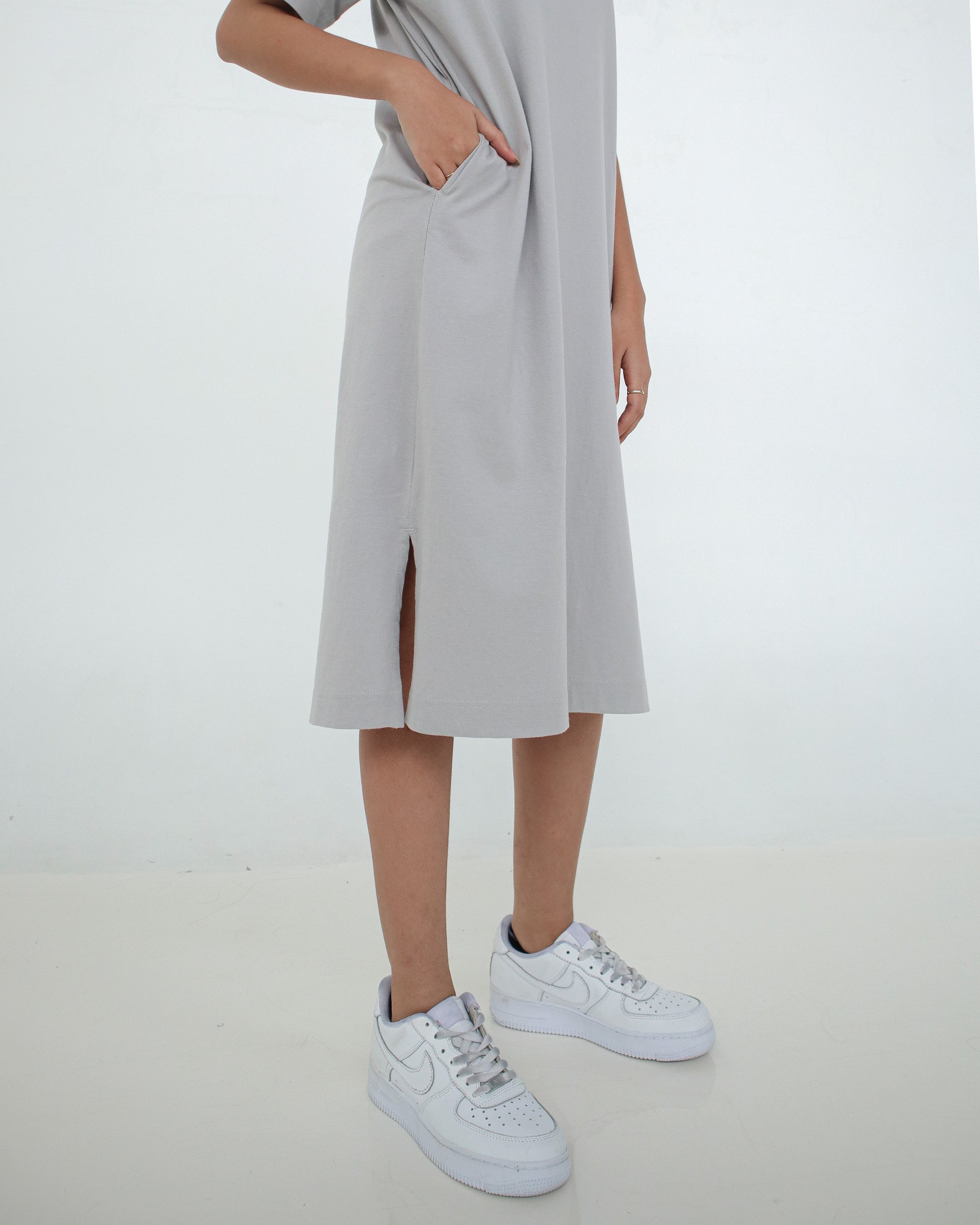 Calf-length T-shirt dress in soft cotton. Straight cut with ribbed crew neck. Dropped shoulders, and side-pockets with Slits at both side.