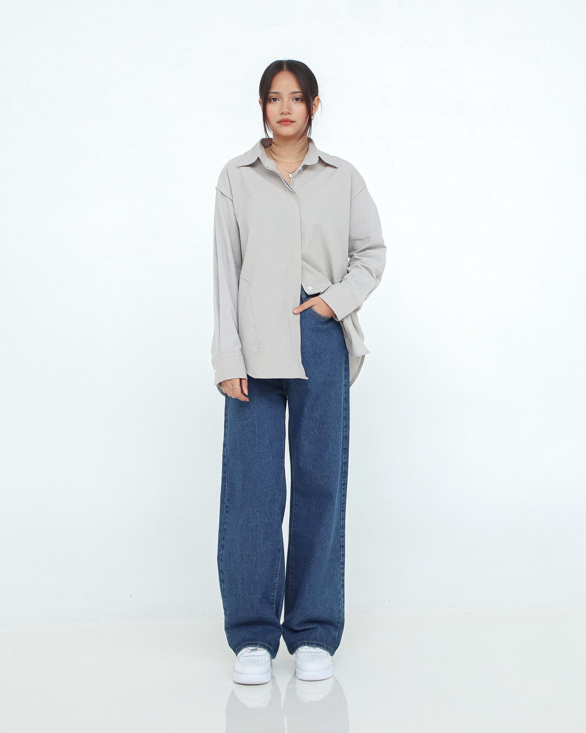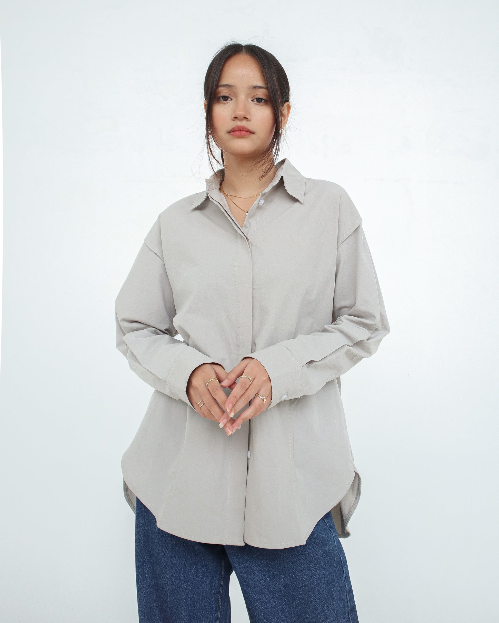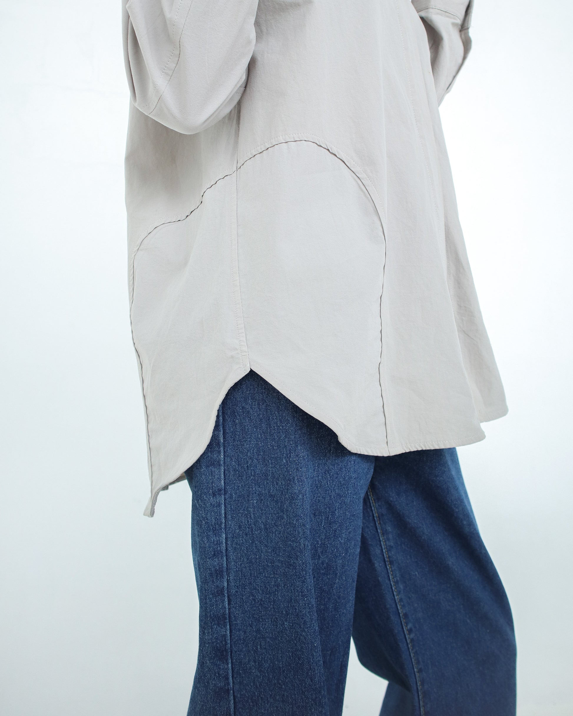 Oversized shirt made with cotton poplin. Collar, hidden button by a placket at the front. Long sleeve with buttoned at the cuff. Crease line on both side and back pleat detail. Rounded hem and slightly longer at the back.