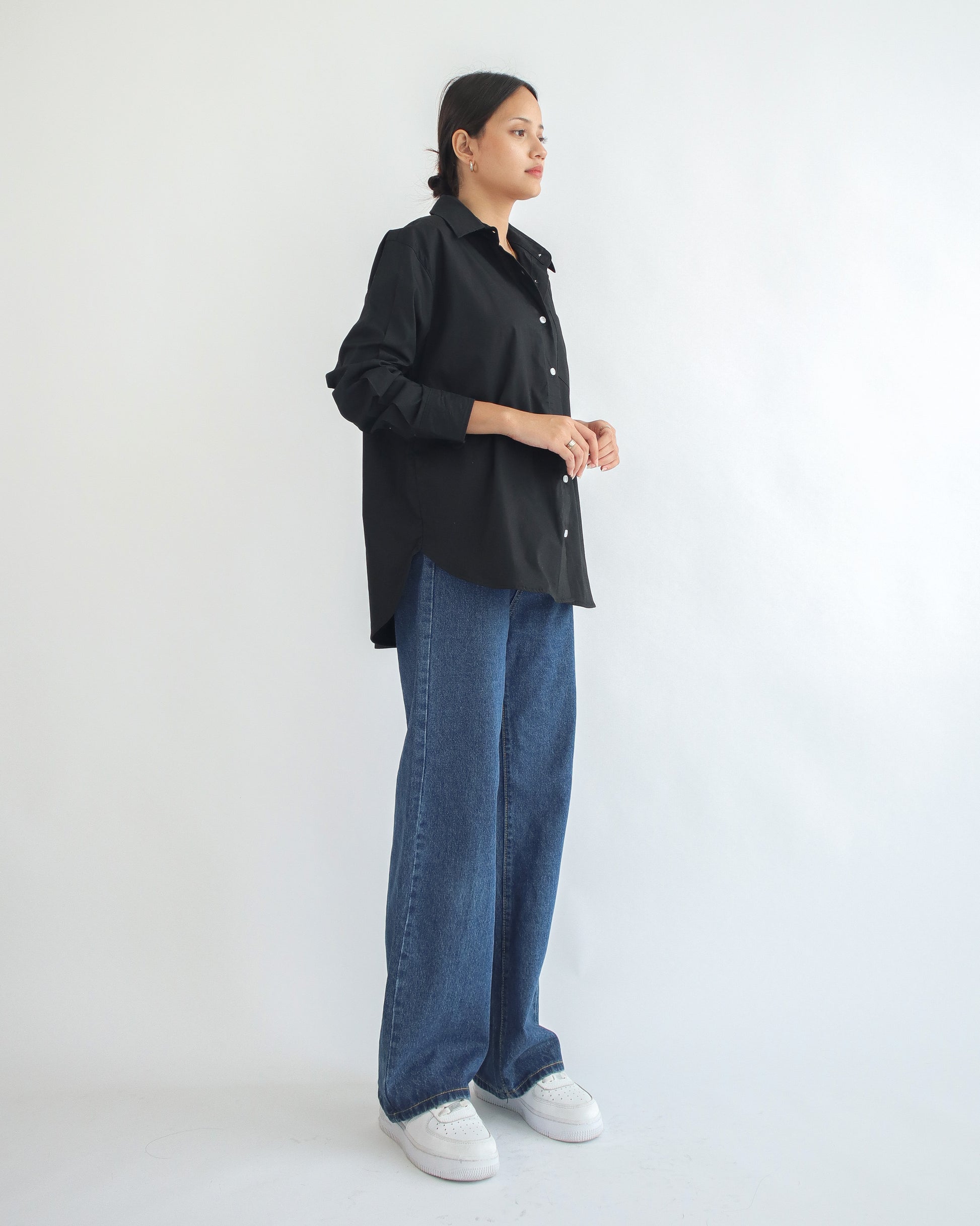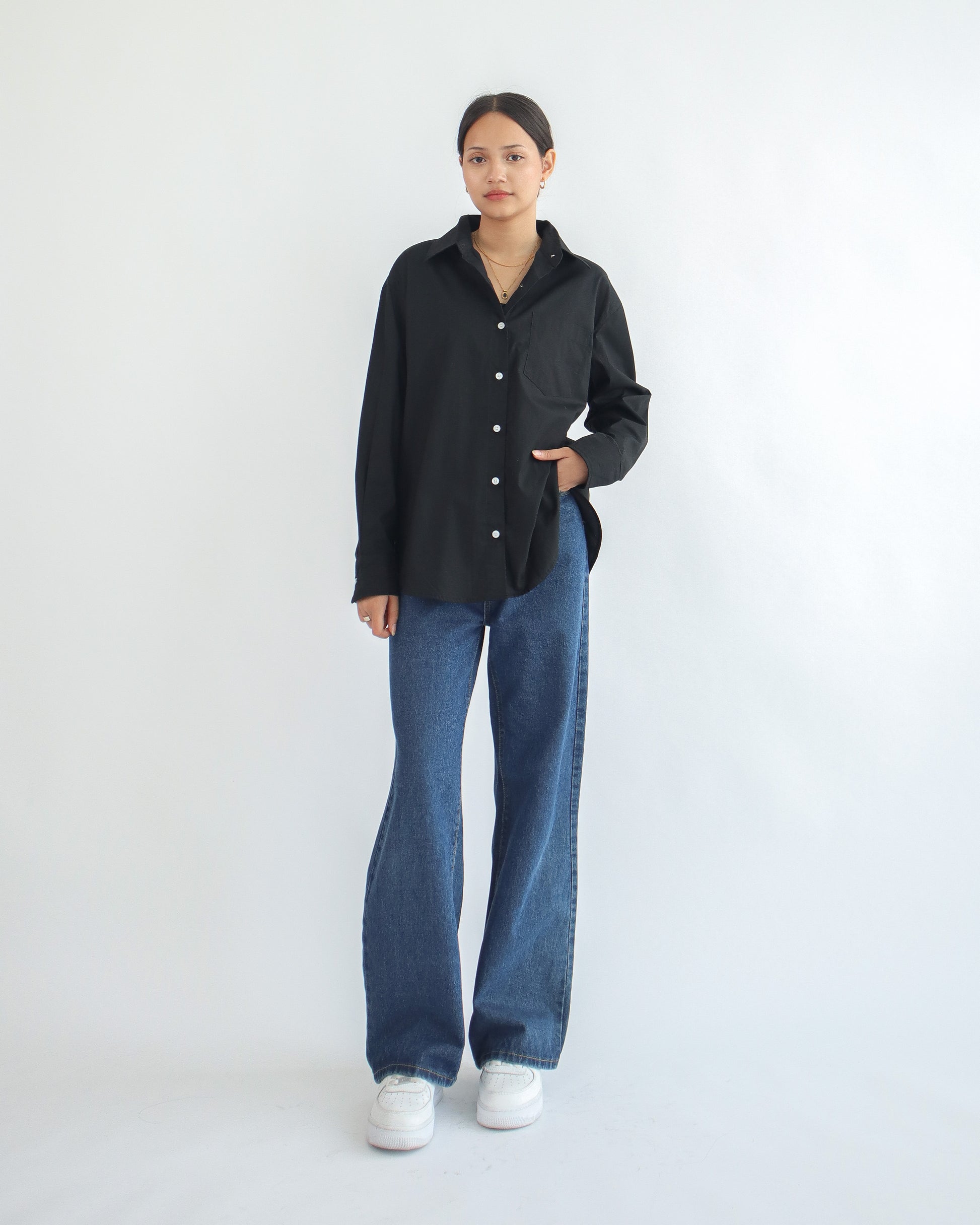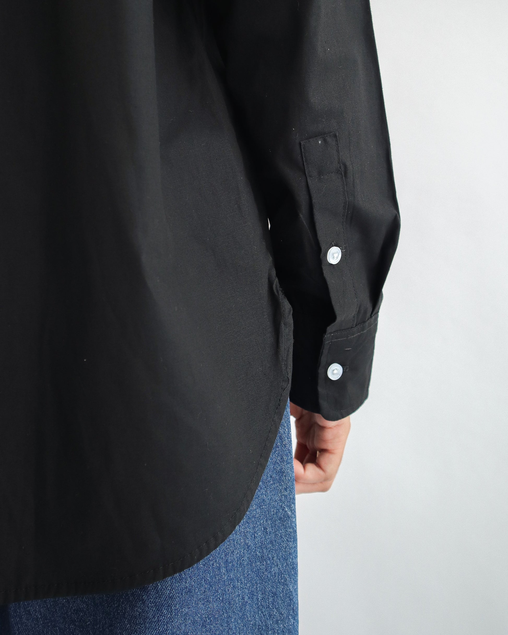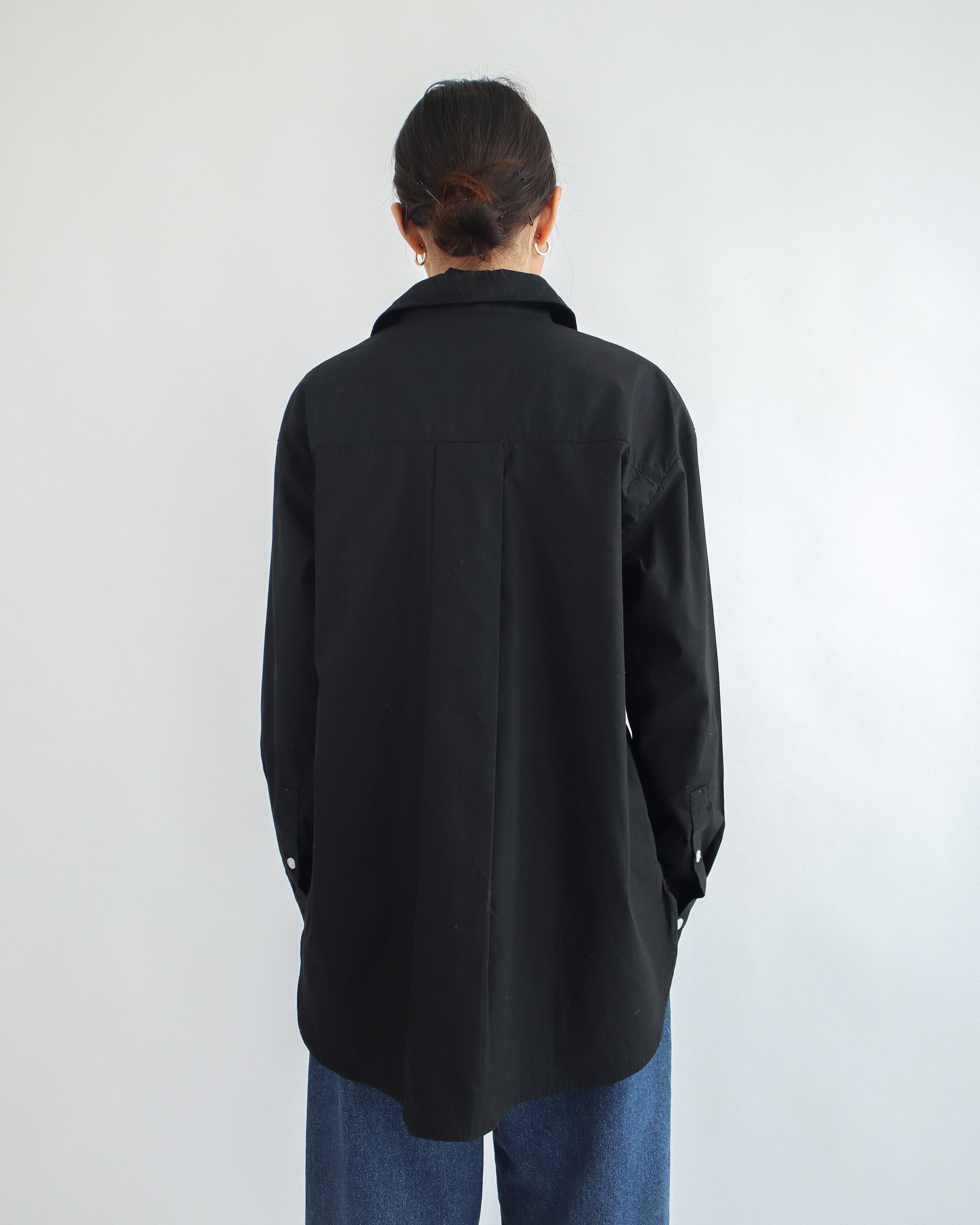 An oversized shirt made with cotton poplin. Featuring long sleeves with button at the cuff. Button embossed fastening and chest patch pocket at the front. A rounded hem and slightly longer at the back.